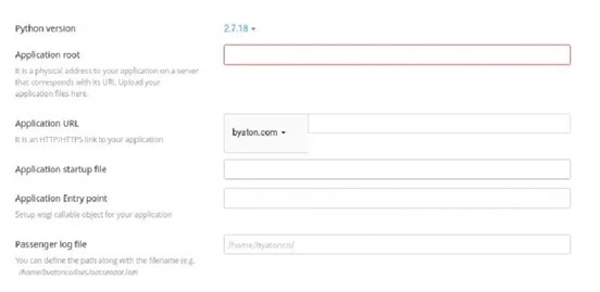 Now, the application form will appear. In the Python Version section, you can select the Python version you want to use and fits your needs. The folder from which all of the Python files will be loaded is the Application root field, so in this text box, type the directory where the application files are located. The URL from which you would like the site to be loaded from is the Application URL. Here, select the domain and then type a URL from the application.