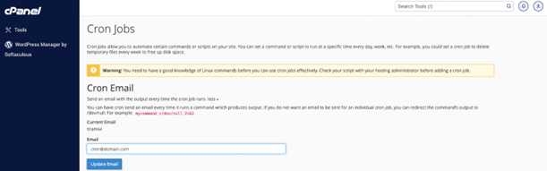 2. For the next section, pick ‘Cron Email’, if you wish to get a report email every time the cron job runs. Then enter or confirm your existing, working email address (by default it uses the cPanel user email address).