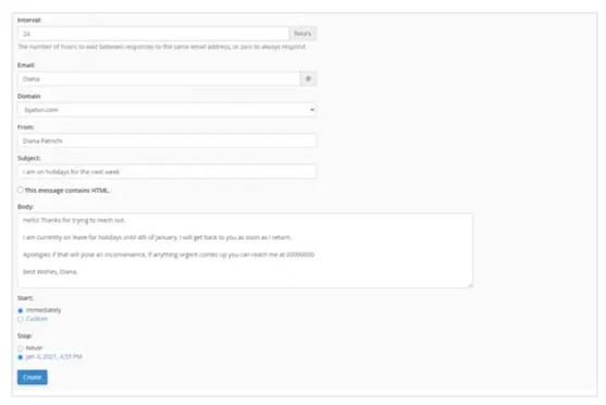 The "Interval" setting refers to the amount of time/hours the Auto-responder should let pass between responding to the same email address. Basically, this setting determines how often a message should be sent to the same sender when one person sends you an email several times.In the "Email" setting, you need to type out your email address. In the "From" setting, you need to put in from whom the message is, so you either put in your name or someone else's, depending on what you want.In the "Subject" set, you put in the subject of the automated email that the Auto-responder would send out. For instance, "In a meeting."In the "Body" setting, you should type out the automated message's content. For this, you can make a custom HTML body that can have various links, images, etc., in them. Usually, people put information like when they are back from a holiday in this setting.The last two settings, the "Stay" and "Stop" boxes, are used to set up the time when the Auto-responder should begin with responding, and it should automatically stop. This means that you will not have to turn it on and off by yourself manually.