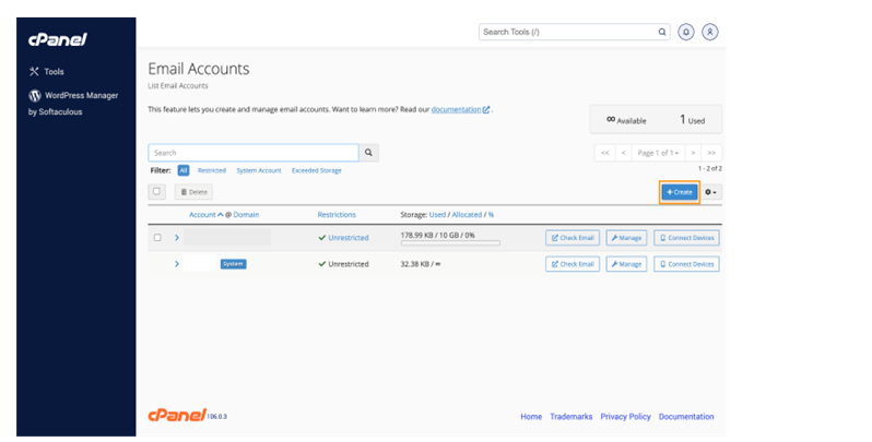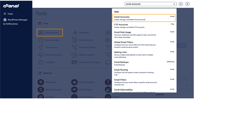 - Once you’re logged in to your cPanel dashboard, go ahead and type in Email Accounts on the top right search bar, or if it’s visible on the dashboard, you can go ahead and click the Email Accounts option under the Email section.
