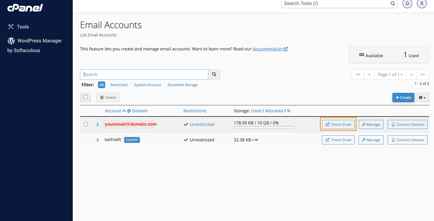 5. You will then be redirected to the previous page where you can see the existing email accounts. To access your inbox, click on the Check Email button.