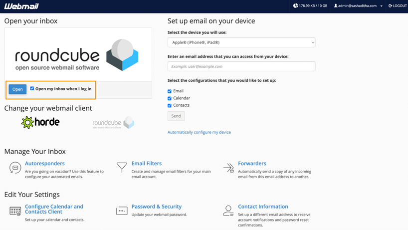 6. You should now be logged in to your Webmail interface. To skip this Welcome Page in the future, you can tick the Open my inbox when I log in option then click the Open button. In this instance, we will choose Roundcube as the Email software.