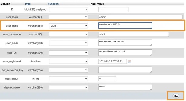 Now there will be several fields you can edit in this particular table row, such as the user name, email address, or password. To set a new password for this user, go to the “user_pass” column, set the “Function” to “MD5” and input the new passphrase on the “Value” field accordingly. Then, click Go and wait for the change to be processed and saved.