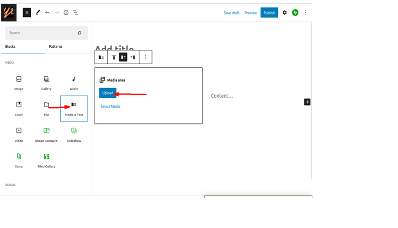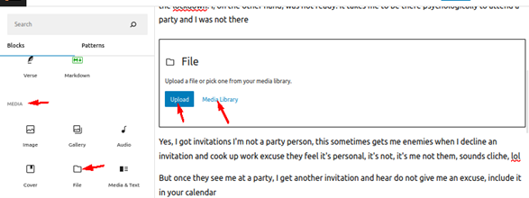 - You'll see a file block appear in the post body. You can drag files from your computer, or click on Upload or Media Library