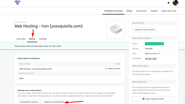 - On the Web Hosting Dashboard page, click billing