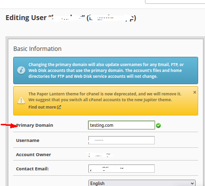 - Type the new domain name in the Primary Domainfield(We recommend you not make any changes in the Username field. Changing the username will cause errors in your database connection)