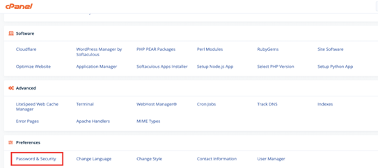 The first thing you need to do is log in to cPanel. On the cPanel home screen, you need to go to the Preferences section and click on Password and Security.